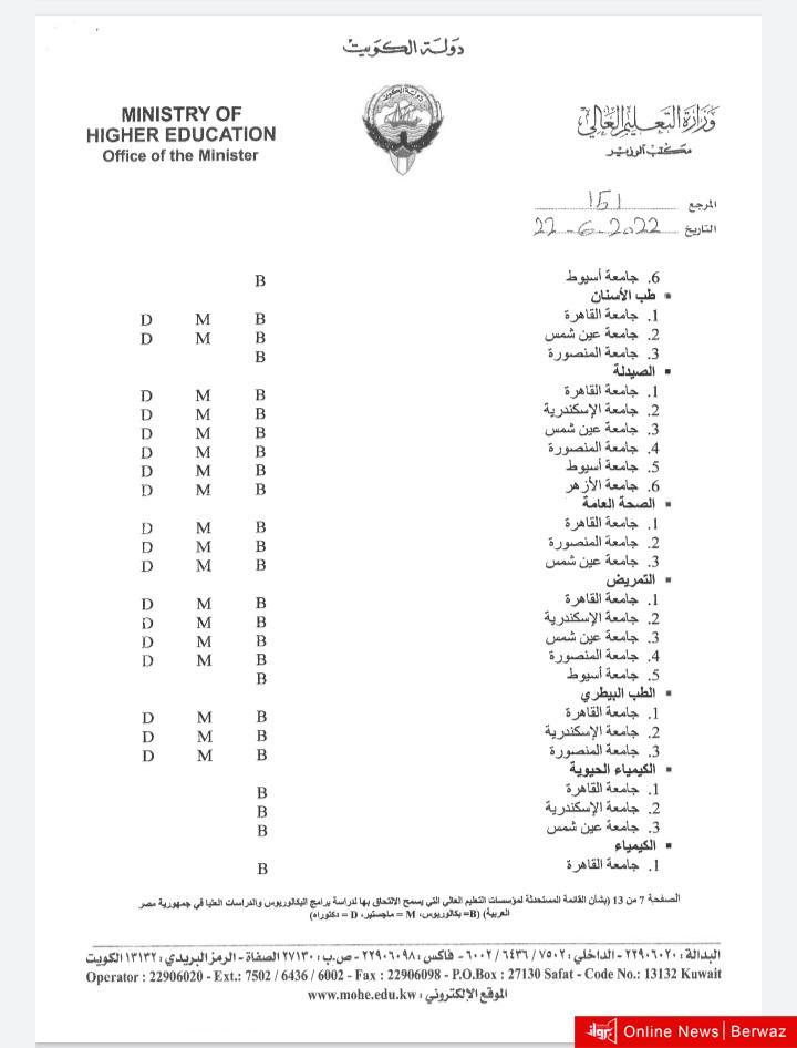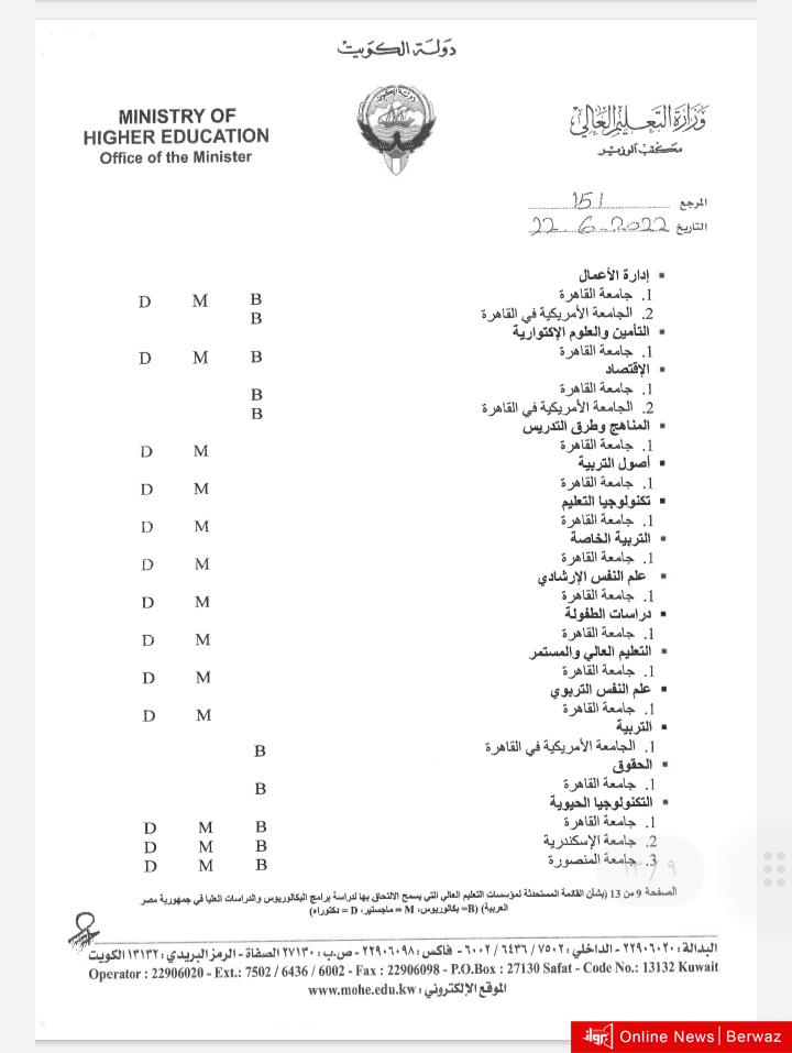 أصدر وزير التربية وزير التعليم العالي والبحث العلمي الدكتور علي المضف، قرارًا وزاريًا يقضي بتحديد التخصصات المعتمدة للدراسة في جمهورية مصر العربية، حيث اشتمل القرار على اعتماد أكثر من 100 تخصص في عدد من الجامعات المصرية.