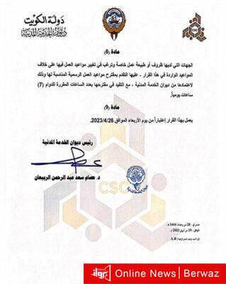 وأكد الديوان أن هذا النظام سيستمر لعدة أشهر حتى الإنتهاء من دراسة نظام الدوام المرن.