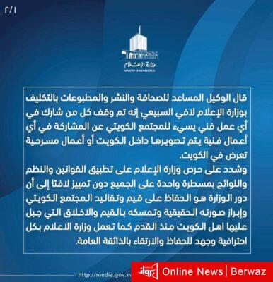 وأضاف البيان: “وزارة الإعلام تحرص على تطبيق القوانين والنظم واللوائح على الجميع دون تمييز، والحفاظ على قيم وتقاليد المجتمع الكويتي والتمسك بالأخلاق والتقاليد والارتقاء بالذوق العام”.