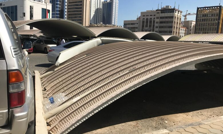 رصد مظلات السيارات في مبنى برج التحرير أعلى برج حكومي في في الكويت و المبنى 11 كأطول برج في العالم و أحد أهم معالم الكويت و وهي “محطمة ” وقد تم كسر أعمدتها لتتهاوى على الارض ولم يتم اصلاحها منذ عده شهور .