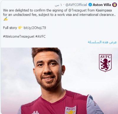 أستون فيلا يعلن تعاقده رسميا مع المصري تريزيجيه