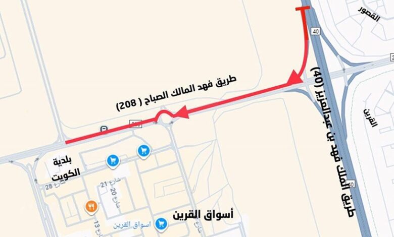 أعلنت الإدارة العامة للمرور إغلاق طريق فهد المالك الصباح (208) ابتداءً من مخرج طريق الملك فهد بن عبدالعزيز (40) باتجاه اليمين وحتى الإشارة المقابلة لمبنى بلدية محافظة مبارك الكبير.