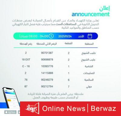 نوهت وزارة الكهرباء والماء عن قيامها بأعمال صيانة غدًا الأحد في المحافظات الست لمحطات التحويل الثانوية، ما سينتج عنه فصل التيار الكهربائي في عدد من المناطق.