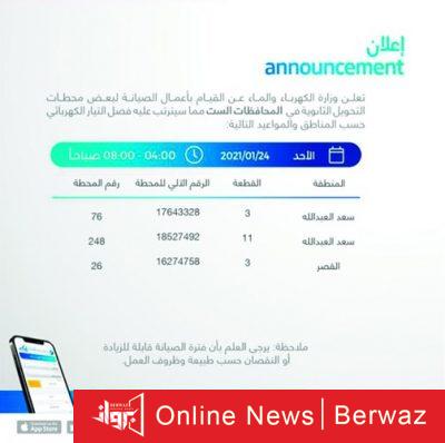 ومن المقرر أن تضم عمليات الصيانة غدًا الأحد المحطات في مناطق جليب الشيوخ والسالمية والشامية وحولي والصليبخات والفحيحيل والصباحية وأبوفطيرة والأحمدي وصباح السالم وسعد العبدالله والقصر.