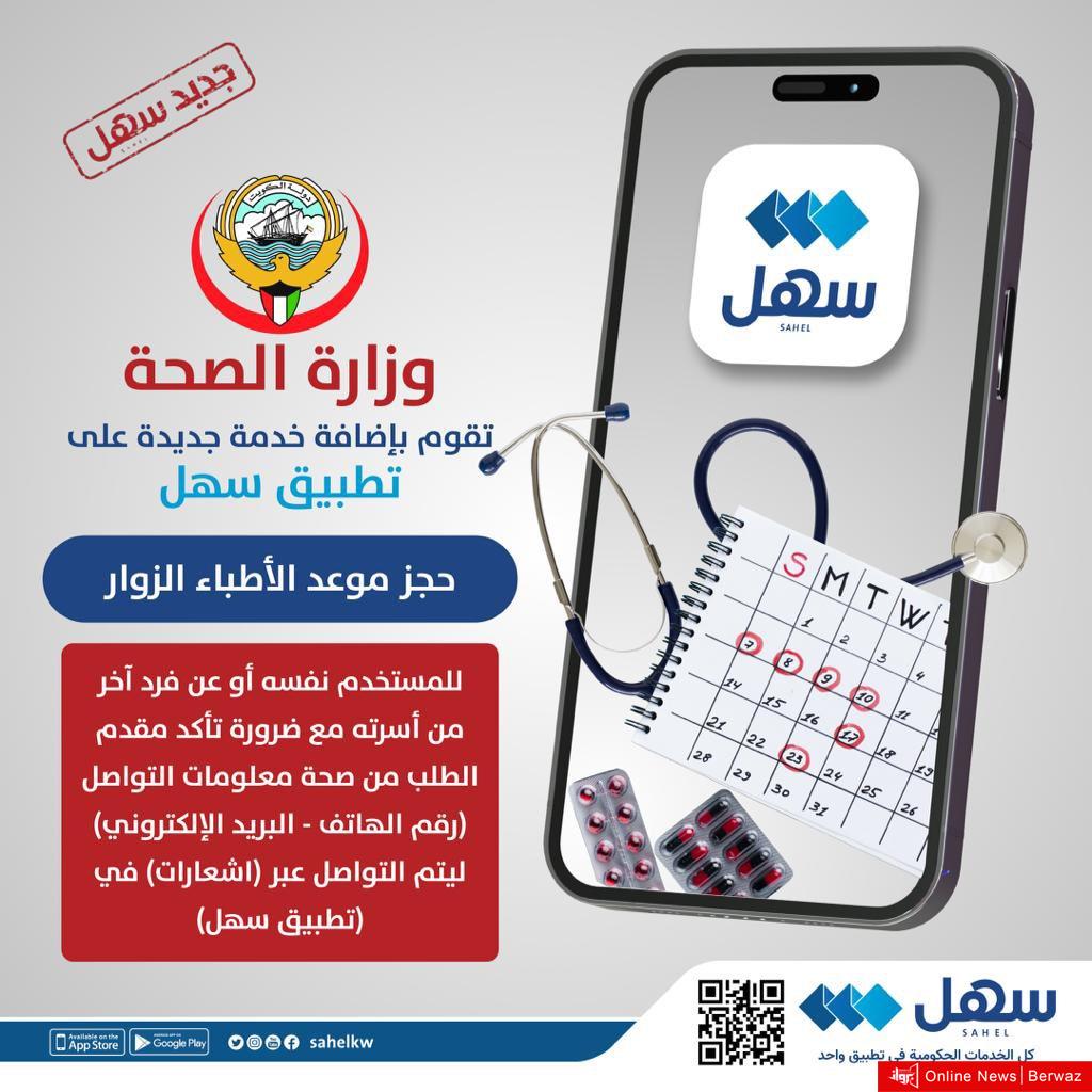 أعلنت وزارة الصحة عن إضافة خدمة «حجز موعد الأطباء الزوار» مباشرة عبر «تطبيق سهل الحكومي» ويمكن ذلك للمستخدم نفسه أو لفرد آخر من أسرته.