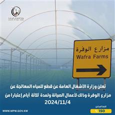 أعلنت وزارة الأشغال العامة عن قطع المياه المعالجة عن مزارع العبدلي للصيانة.