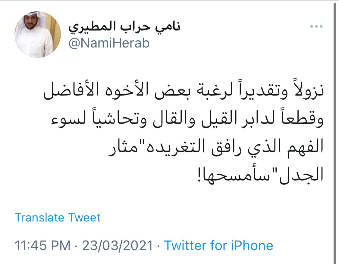 وتتضح الحقيقة بقيام الصحفي نامي حراب المطيري بكتابة تغريدة جاءت كالتالي