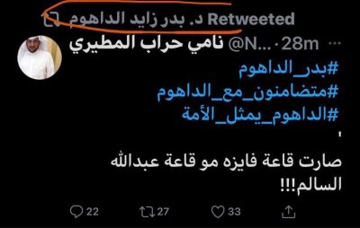 فيما لم يتضح ولم يتم التأكد من حقيقة قيام د. بدر الداهوم من اعاده تغريدها أم انها مفبركة نظرا لقيام صاحب التغريدة الأساسية بمسحها .