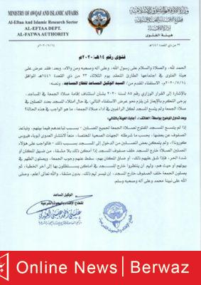 أعلنت هيئة الفتوى بوزارة الأوقاف والشؤون الإسلامية، فتوى رقم 14 ه ۲۰۲۰ م حيث نشرت فيها أنه إذا لم يتسع المسجد المفتوح لصلاة الجمعة فالواجب على المصلين الصلاة خارج المسجد فإن شق عليهم سقط عنهم وجوب الجمعة ويصلون الظهر في بيوتهم أو حيث هم.