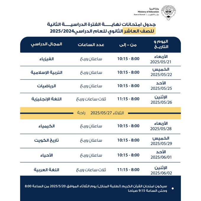 الصف العاشر والحادي عشر (علمي وأدبي): تبدأ الاختبارات يوم الأربعاء الموافق 21 مايو 2025.