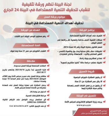 تنظم لجنة شؤون البيئة ورشة عمل لتحقيق التنمية المستدامة في البيئة ورفع مستوى الوعي البيئي لدى الشباب، وذلك لمدة يوم واحد في 24 الشهر الجاري في مسرح مجلس الأمة.