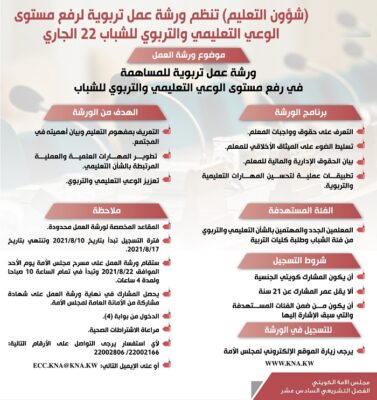 تنظم لجنة شؤون التعليم والإرشاد والثقافة ورشة عمل تربوية للمساهمة في رفع مستوى الوعي التعليمي والتربوي للشباب، وذلك لمدة يوم واحد الأحد 22 الشهر الجاري في مسرح مجلس الأمة.