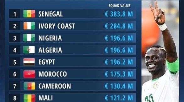 وجاء المنتخب الجزائري في المرتبة الرابعة أفريقياً بقيمة تسويقية بـ196.6مليون يورو، فيما تصدر المنتخب السنغالي قائمة الأغلى بـ383.8 مليون يورو.