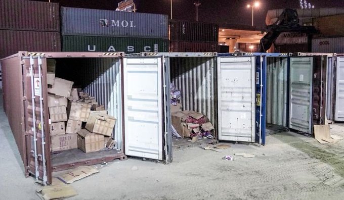 وقد كان نائب المدير العام لشؤون المنافذ الشيخ فيصل العبدالله الغداة، تلقى بياناً من مدير جمارك الموانئ التي بالشمال صالح الحربي، بوصول الحاويات إلى ميناء الشويخ وبفتح الحاويات عثر فيها على البضائع المخالفة للملكية الفكرية وتبين انها مقلدة وفي طريقها لأن تباع في أماكن البيع والشراء بإعتبارها بضائع أصلية.