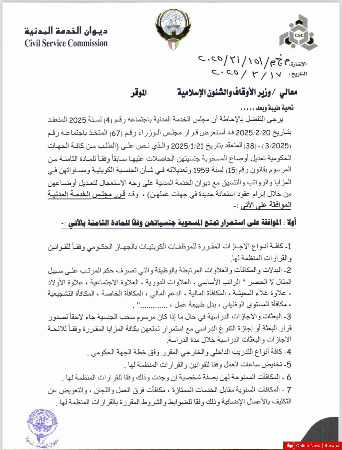قرر مجلس الخدمة المدنية استمرار تمتع الموظفات المسحوبة جنسياتهن وفق المادة الثامنة من قانون الجنسية بجميع المزايا الوظيفية والمالية، بما في ذلك الرواتب، الإجازات، البدلات، العلاوات، البعثات الدراسية، التدريب، تخفيض ساعات العمل، والمكافآت السنوية.