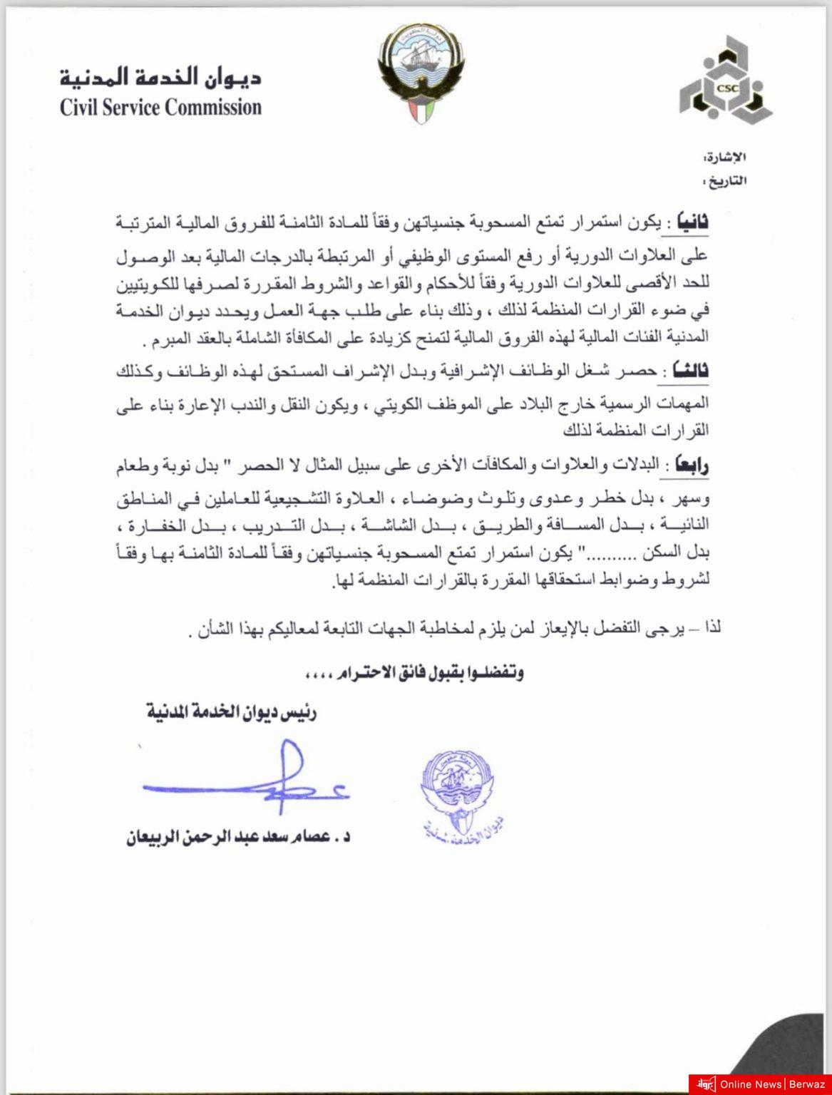 وأكد القرار أن الموظفات سيواصلن الحصول على جميع الحقوق المقررة للموظفات الكويتيات في الجهاز الحكومي، بما يشمل الراتب الأساسي، العلاوات الدورية والاجتماعية، علاوة الأولاد، غلاء المعيشة، المكافآت المالية، وبدل طبيعة العمل، إضافة إلى البعثات والإجازات الدراسية والتدريب الداخلي والخارجي، وفق الضوابط المعتمدة.