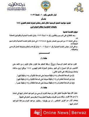 وحدد قرار الخدمة المدنية أن تكون مواعيد العمل الرسمية (مرنة) وفقًا لأحكام هذا القرار خلال الأيام (من الأحد حتى الخميس من كل أسبوع في شهر رمضان المبارك) بواقع أربع ساعات ونصف يوميًا وذلك على النحو التالي: