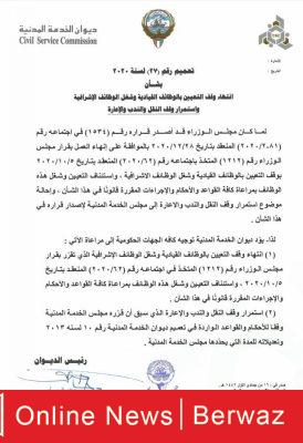 في حين شدد الديوان على استمرار وقف النقل والندب والإعارة الذي سبق أن قَرّره مجلس الخدمة المدنية، طبقًا للأحكام والقواعد الواردة في تعميم ديوان الخدمة المدنية رقم ١٠ لسنه 2013 وتعديلاته للمدة التي يحددها مجلس الخدمة المدنية.