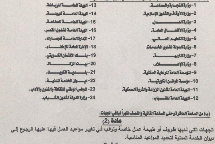 وقال الديوان إن مواعيد العمل الرسمية للوزارات والجهات الحكومية ستكون من الساعة التاسعة والنصف وحتى الثانية ظهرًا من الأحد وحتى الخميس، على ان تكون المواعيد لباقي الجهات من الساعة العاشرة صباحًا وحتى الثانية والنصف ظهرًا.