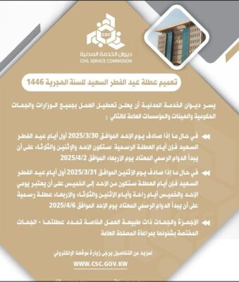 يسر ديوان الخدمة المدنية أن يعلن تعطيل العمل بجميع الوزارات والهيئات والمؤسسات العامة كالتالي :