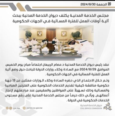 وعلى إثر ذلك كلف المجلس ديوان الخدمة المدنية بالتباحث مع وكلاء وزارات الخدمات لوضع آلية جديدة لتقديم الخدمات الحكومية للمواطنين والمقيمين على فترتين صباحية ومسائية.