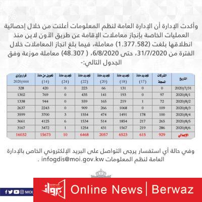 فيما بلغ إنجاز المعاملات خلال الفترة من 31 يوليو إلى 6 أغسطس 48.307 معاملة وفيما يلي الجدول بالتفاصيل.