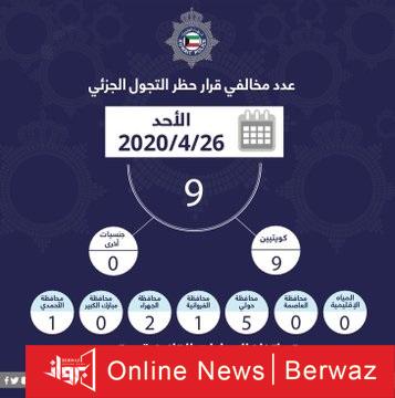 أعلنت وزارة الداخلية، اليوم الإثنين، إن عدد المخالفين لحظر التجول الجزئي أمس الأحد بلغ 9 مخالفين، وكان جميعهم مواطنين كويتيين. فيما كامن محافظة حولي صاحبة النصيب الأكبر وفيما يلي تفاصيل محافظات المخالفين.