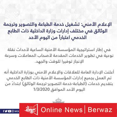 كشفت وزارة الداخلية عن إعادة تشغيل خدمة الطباعة والتصوير وترجمة الوثائق في مختلف إدارات وزارة الداخلية ذات الطابع الخدمي على أن يتم ذلك إعتبارًا من اليوم الأحد.