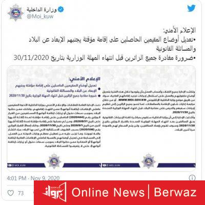 أعلنت وزارة الداخلية الكويتية أنها لن تقوم بتمديد فترة السماح التى أعطتها للوافدين المنتهية تأشيراتهم بعد 30 نوفمبر الحالى، ولذلك فإنه يتحتم على 190 ألف وافد أن يجددوا تأشيراتهم حيث سيحتاجون إلى القيام بذلك قبل الموعد النهائي فى حالة إذا أرادوا البقاء في البلاد.