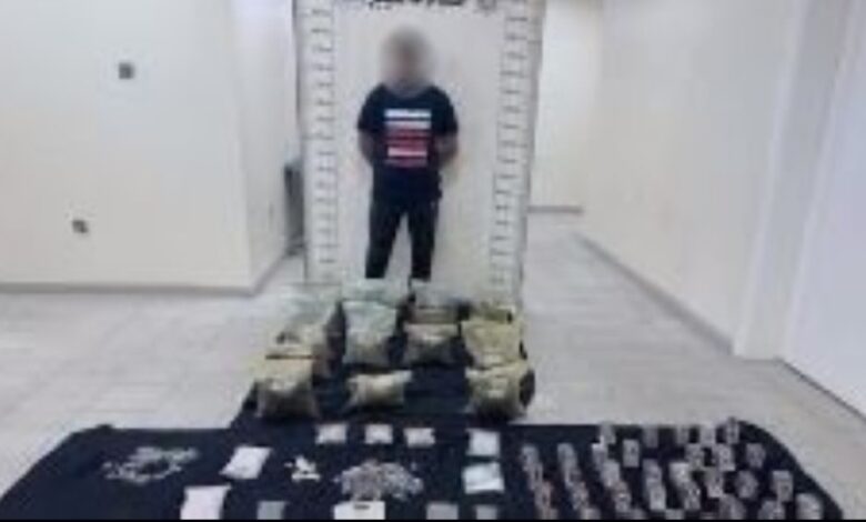 كما تم ضبط 3.25 كيلوغرامات من المارجوانا، و20 غرامًا من الهيروين، و75 غرامًا من الحشيش، وسيجارة ملفوفة، إلى جانب 5 علب من زيت الحشيش المستخدم في السجائر الإلكترونية.