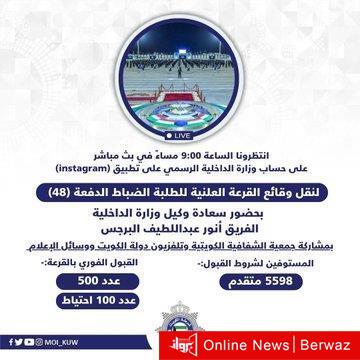 أعلنت وزارة الداخلية عن نقل وقائع القرعة العلنية للطلبة الضباط الدفعة 48 في تمام الساعة 9:00 مساءً في بث مباشر على حساب الوزارة الرسمي على تطبيق انستقرام.