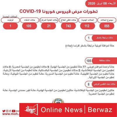 ‏كشفت وزارة الصحة عن تسجيل 112 إصابة مؤكدة بفيروس كورونا خلال الـ24 ساعة الماضية ليرتفع اجمالي عدد الإصابات المؤكدة في الكويت إلى 855.