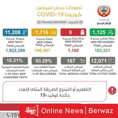 يُذكر أن وزارة الصحة قد أعلنت في وقت سابق من اليوم شفاء 1125 إصابة في الساعات ال24 الماضية ليبلغ مجموع عدد حالات الشفاء 183321 حالة.