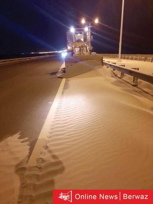 فيما لفتت إلى حرص الهيئة إلى إزالة الرمال المتراكمة على جسم الجسر أولًا بأول، وجميع الطرق السريعة، وذلك حفاظًا على سلامة مستخدمي الطريق.