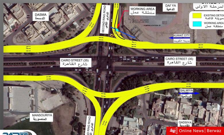أفصحت الهيئة العامة للطرق والنقل البري اليوم عن غلق حارة مرورية واحدة لمدة 48 ساعه فقط على مرحلتين للتحويلة المرورية بطريق الدائرى الثاني بالتقاطع مع شارع القاهرة للمتجه إلى شارع الخليج العربى وذلك لعمل خط صرف النفق النهائى بالمنطقة.
