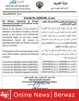 أعلنت إدارة الطيران المدني تعميمًا رسميًا لشركات الطيران العاملة في مطار الكويت الدولي بخصوص استئناف الرحلات التجارية إعتبارًا من تاريخ 2021/1/2 الساعة الرابعة فجرا..