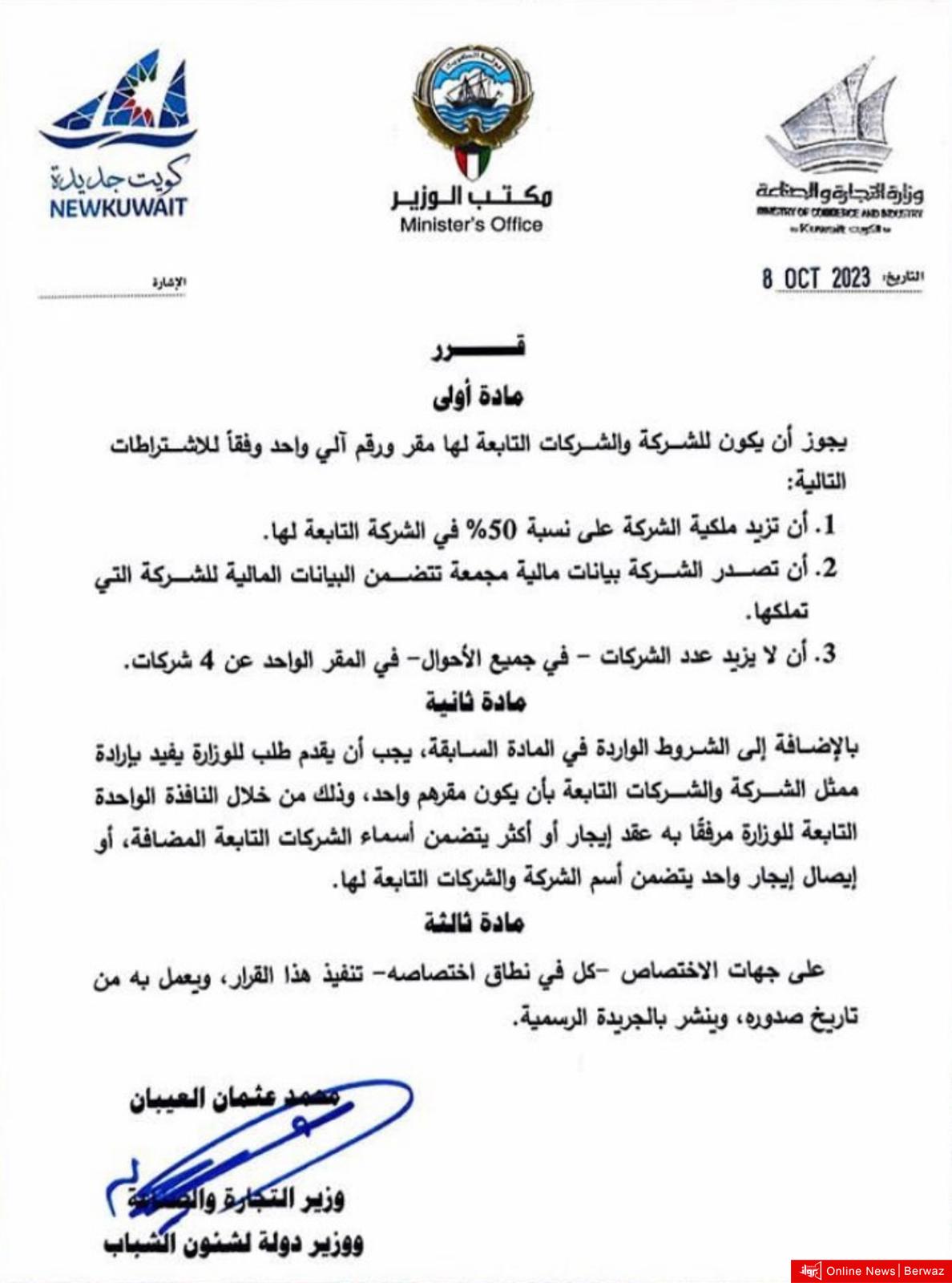أفصح وزير التجارة محمد العيبان عن قرار حديد يسمح للشركات والشركات التابعة لها بأن يكون لها رقمًا آليًا موحدًا واحدًا فقط.