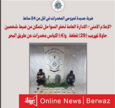 وتمكن رجال خفر السواحل من ضبط شخصين معهم 29 قطعة و 4 أكياس تحتوي على مواد يشتبه بانها مواد مخدرة كانت مخبأة في البحر.
