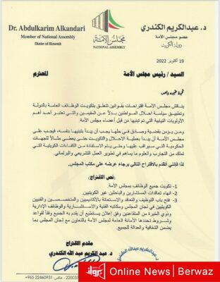 تقدم النائب الدكتور عبدالكريم الكندري باقتراح بتكويت جميع الوظائف في مجلس الأمة وإنهاء تعاقدات المستشارين والباحثين غير الكويتيين، وفتح باب التوظيف والتعاقد والاستعانة بالأكاديميين والمتخصصين والفنيين الكويتيين في لجان المجلس ومكاتبه الفنية والاستشارية والوظائف الإدارية وذوي الخبرة من المتقاعدين.