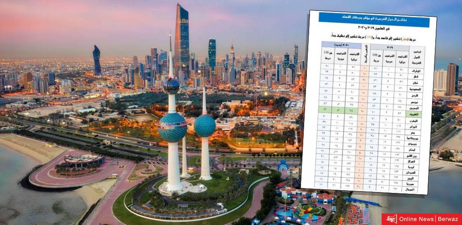 فيما حصدت الكويت المرتبة 7 عربيًا بتقدم مركزين عن العام الماضي، وبرغم التقدم حصدت الكويت 42 درجة من 100، في مؤشر 2020 وذلك بفارق نقطتين عن العام الماضي الذي سجلت فيه 40 درجة.