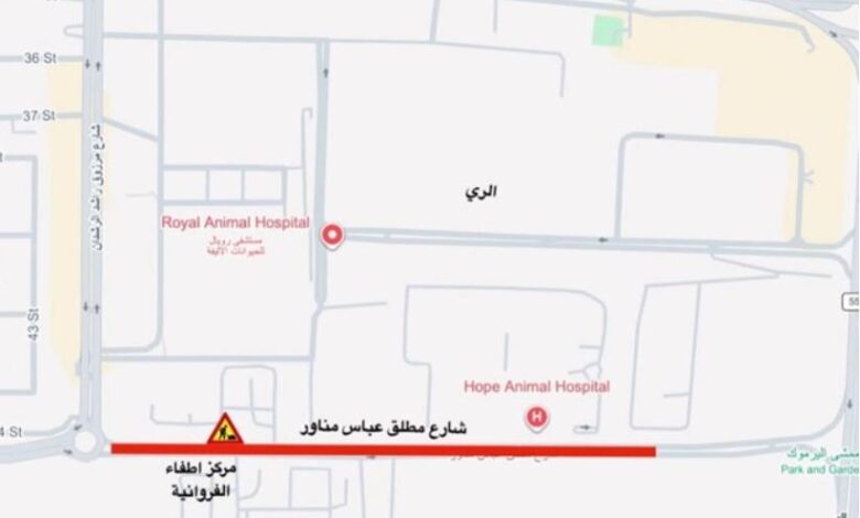 أعلنت الإدارة العامة للمرور عن إغلاق كامل لشارع مطلق عباس مناور، من دوار مركز إطفاء الفروانية إلى دوار سوق الجمعة، اعتبارًا من يوم الأحد 1 فبراير وحتى الاثنين 16 فبراير.