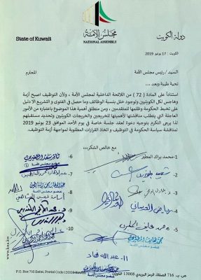 وقال المطير عبر حسابه الشخصي على تويتر: “لقد حصلنا على التوقيعات الكافية لإقامة جلسة خاصة لمناقشة سياسة التوظيف والظلم الذي وقع على المتقدمين على وظيفة محامي في الفتوى والتشريع.. وتم تقديم الطلب اليوم”.
