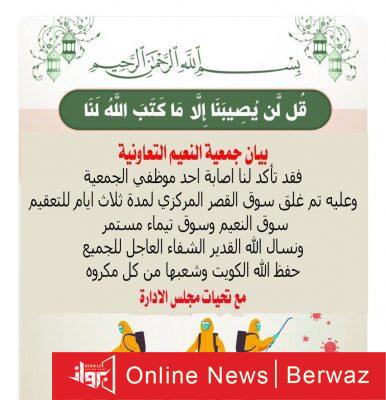 كشفت جمعية النعيم التعاونية عن إصابة أحد موظفي الجمعي وهو ما تقرر عليه إغلاق سوق القصر المركزي لمدة 3 أيام للتعقيم.