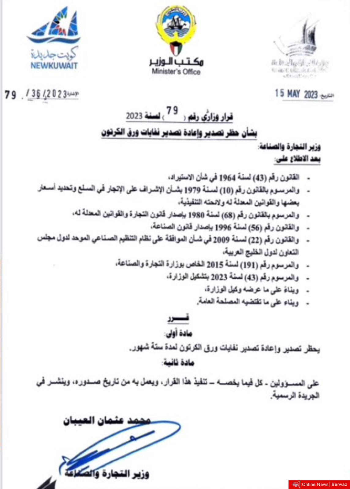 أمر وزير التجارة والصناعة محمد عثمان العيبان من خلال قرار رسمي بحظر تصدير وإعادة تصدير نفايات ورق الكرتون لمدة 6 أشهر.