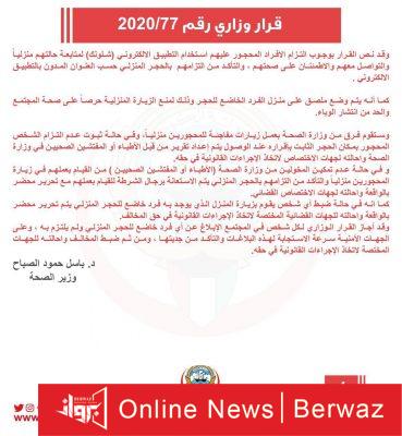 ومن جانبه أصدر وزير الصحة الشيخ الدكتور باسل الصباح قرارًا وزاريًا الأحد قبل الماضي بإعتماد الآلية اللازمة لتطبيق الحجر المنزلي بما يضمن الحفاظ على صحة وسلامة المجتمع وذلك في إطار الجهود والإجراءات التي تتخذها الوزارة لمواجهة إنتشار فيروس كورونا المستجد (سارس كوف – 2) المسبب لمرض (كوفيد – 19).