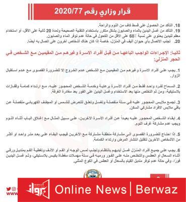 ومن جانبه أصدر وزير الصحة الشيخ الدكتور باسل الصباح قرارًا وزاريًا الأحد قبل الماضي بإعتماد الآلية اللازمة لتطبيق الحجر المنزلي بما يضمن الحفاظ على صحة وسلامة المجتمع وذلك في إطار الجهود والإجراءات التي تتخذها الوزارة لمواجهة إنتشار فيروس كورونا المستجد (سارس كوف – 2) المسبب لمرض (كوفيد – 19).