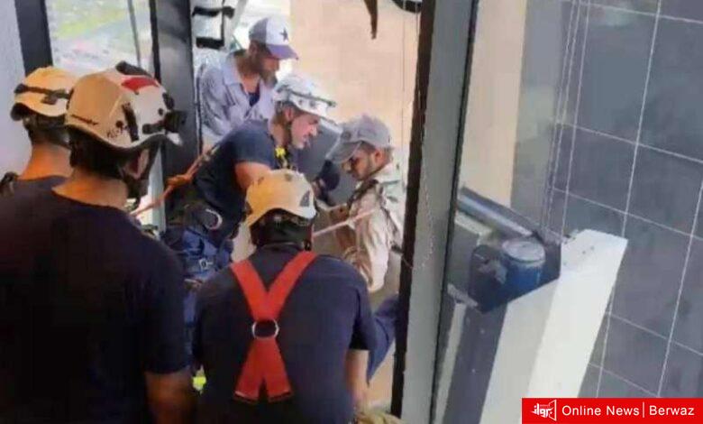 كما بينت الإدارة أن إدارة العمليات المركزية وجهت فرق الإطفاء من مركزي المدينة والبحث والإنقاذ لموقع البلاغ وعقق وصول الفرق أتضح أن شخصين عالقين على متن سقالة بالدور 27 في مبنى مكون من 38 دورا وتم إنقاذ الشخصين العالقين ولم ينتج عن الحادث أي إصابات تذكر .