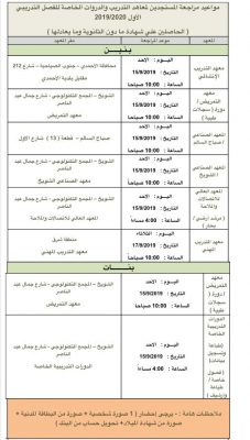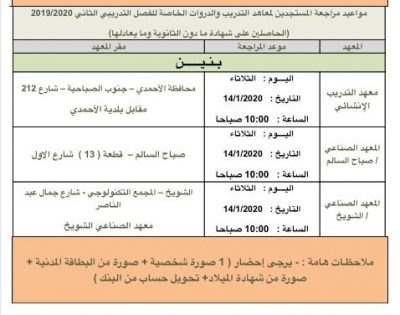 كما أفاد أن على المقبولين المستجدين للفصل الأول مراجعة المعاهد التي تم قبولهم بها حسب المواعيد المعلنة مصطحبين معهم (صورة عن البطاقة المدنية وشهادة الميلاد وعدد(1) صور شخصية وتحويل حساب البنك) عند المراجعة.
