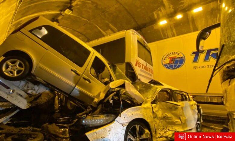 لحظة وقوع حادث سير متسلسل في نفق بتركيا، أسفر عن اصطدام 30 سيارة ببعضها البعض، واصابة 18 شخص.