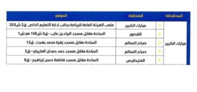 وبين التعميم أنه تم تخصيص عدد 10 مصليات في محافظة العاصمة و6 في محافظة حولي و10 في محافظة الفروانية و6 في محافظة الجهراء و5 في محافظة مبارك الكبير و12 في محافظة الأحمدي.